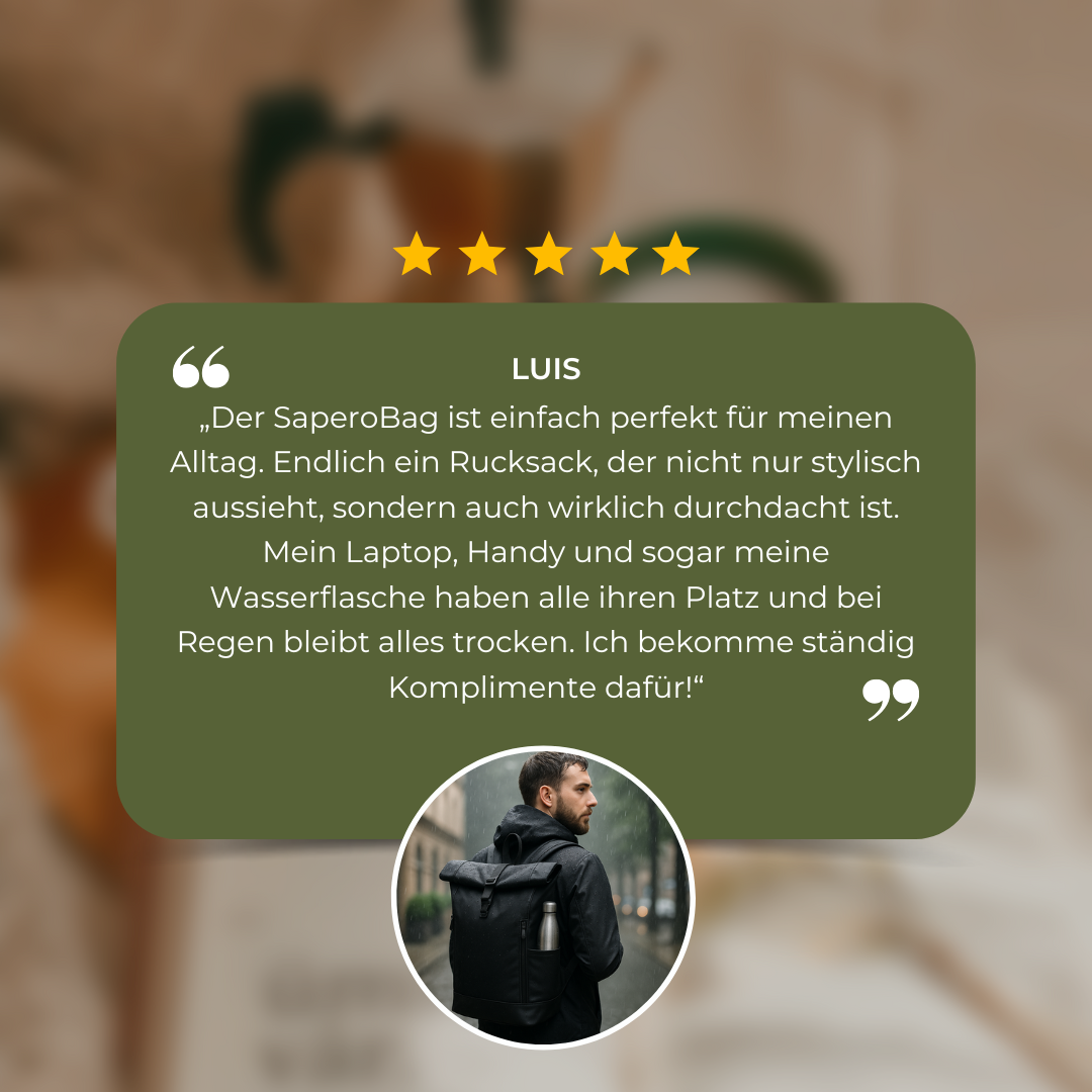 Ein Rucksack - Unzählige Möglichkeiten. Der SaperoBag begleitet dich überall – ob im Alltag, im Büro, auf Reisen oder beim Camping. Modernes Design trifft auf höchsten Tragekomfort und macht ihn zum angenehmsten Begleiter für jede Situation. Werde Teil der SaperoBag-Community und erlebe selbst, warum schon über 10'000 Kunden begeistert sind.
