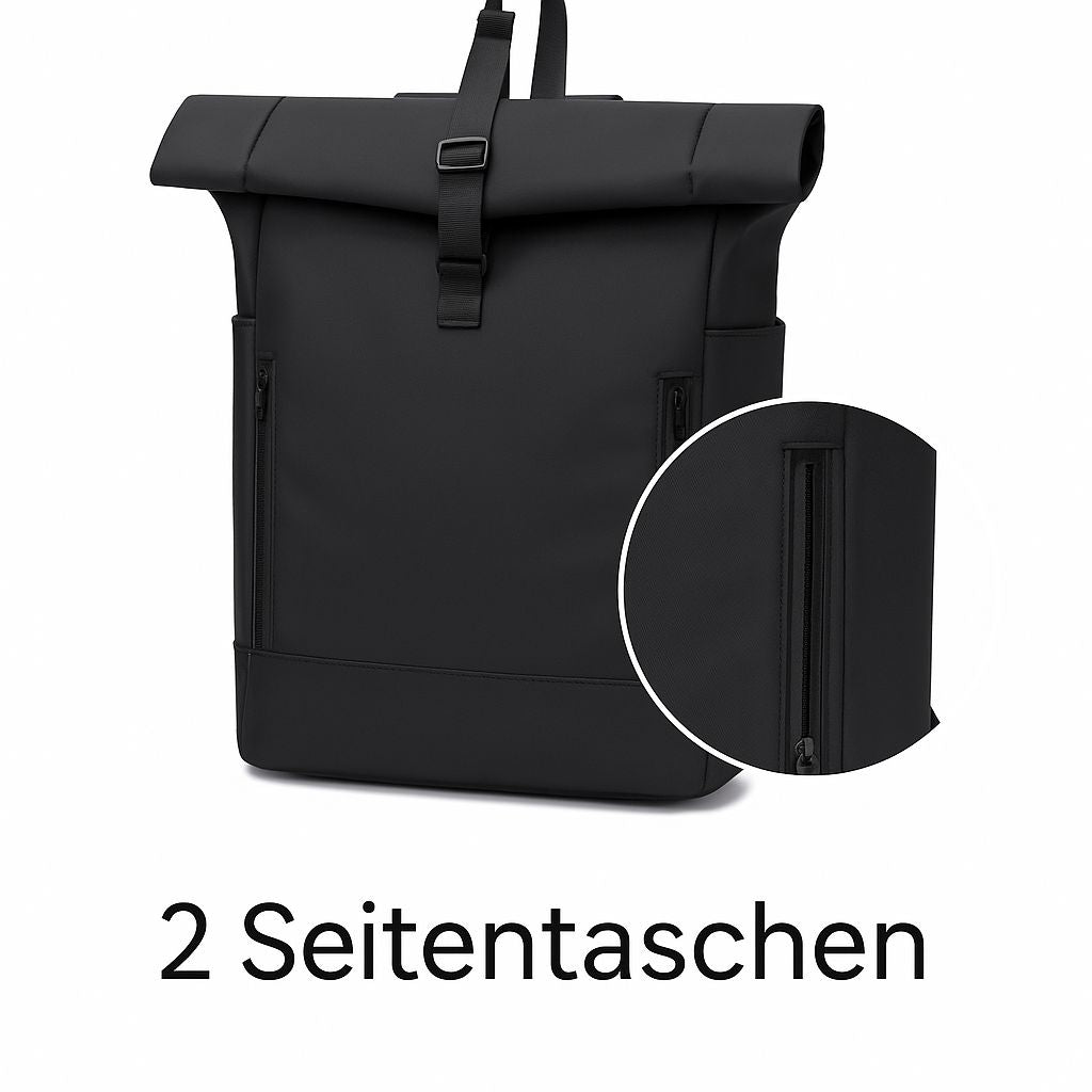 Schlicht, modern und funktional – dieser Rolltop-Rucksack begleitet dich im Alltag, beim Arbeiten und auf Reisen.